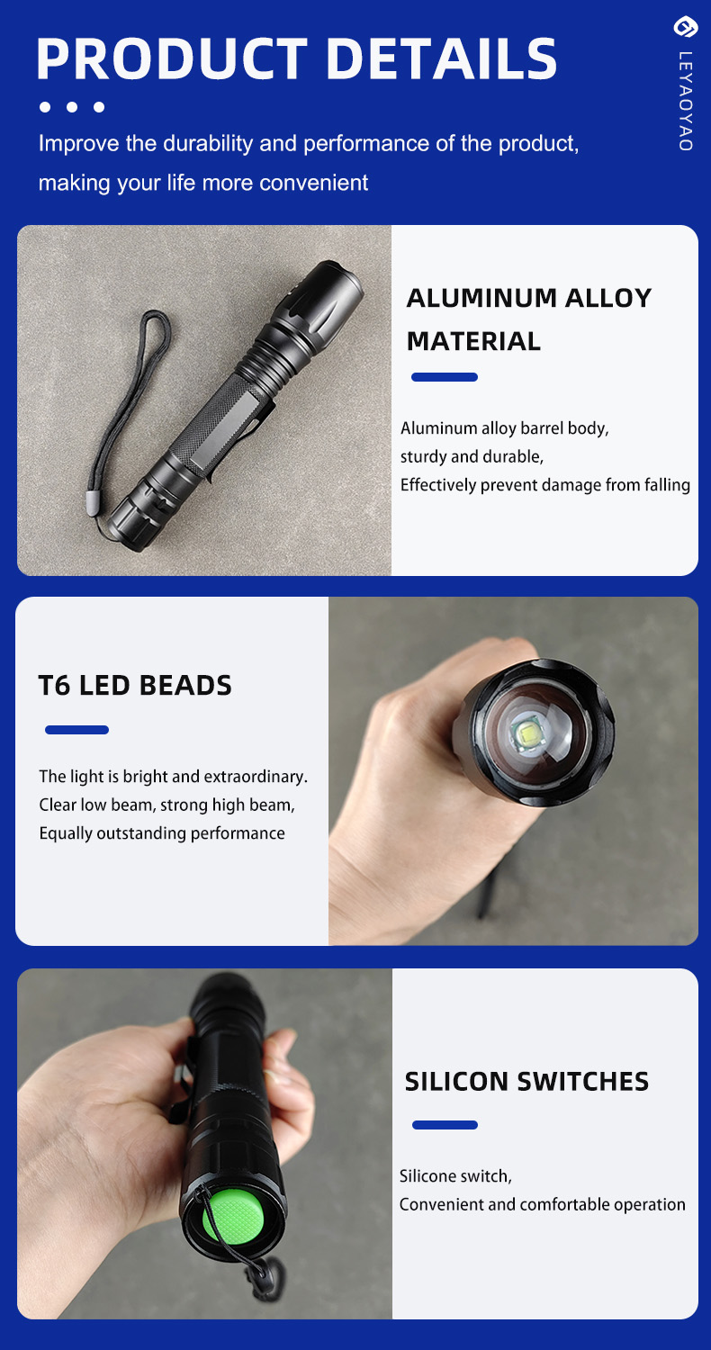 The scalable tactical flashlight is a multifunctional flashlight made of high-quality aluminum alloy, designed to meet the diverse needs of outdoor enthusiasts, emergency response personnel, and tactical professionals. This flashlight has an output power ranging from 300 lumens to 500 lumens, making it a reliable companion in low light conditions, providing excellent visibility and clarity. This LED flashlight features a range of functions, including strong, medium, weak, and strobe SOS modes, providing users with multiple lighting options to adapt to various scenarios. The telescopic zoom function further enhances its practicality, allowing for the adjustment of focal length and beam distance. In addition, this flashlight is compatible with rechargeable batteries, providing a sustainable and cost-effective power solution for long-term use.